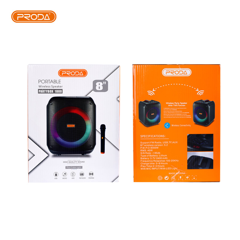 اسپیکر پارتی باکس ۱۰۰۰ پرودا Prodaیک اسپیکر پرقدرت و کارآمد است که به دلیل ویژگی‌ها و مشخصات متنوعش، توانسته است جای خود را در بازار پیدا کند. این اسپیکر با وزنی حدود ۲.۵ کیلوگرم، یک ترکیب مناسب از سبکی و قدرت را فراهم می‌کند.