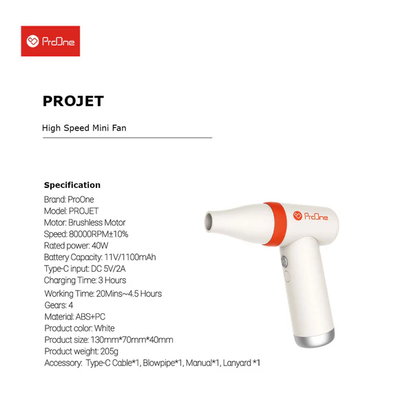 این دمنده با ابعاد 40*70*130 میلی‌متر و وزن 205 گرم، یک دستگاه سبک و قابل حمل است که استفاده از آن را در مکان‌های مختلف آسان می‌سازد. جنس بدنه از PC+ABS، ظرفیت باتری 1100mAh، ولتاژ شدت جریان ورودی 5V/2A و توان خروجی 40 وات، از جمله مشخصات فنی این دستگاه هستند که نشان از کیفیت ساخت بالا و توانایی‌های قابل توجه آن دارند. سرعت موتور این دمنده نیز به 80000 دور در دقیقه می‌رسد، که این امر باعث می‌شود تا جریان هوای قوی و مؤثری ایجاد کند.