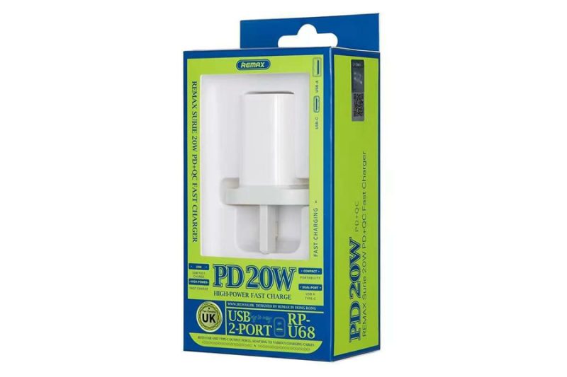 شارژر دیواری ریمکس مدل RP-U68 دارای PD و توان20 وات مناسب برای انواع دستگاه ها به خصوص آیفون 12/12pro/12pro max/13/13promax/13pro با وزنی سبک ,دارای ترانسفورماتور با کارایی بالا می باشد. این اداپتور دارای دو درگاه خروجی می باشد که یکی تایپ سی 20 وات و دیگری USB3 ـ18 وات می باشد و از فناوری PD و QC بهره میبرد که باعث شارژ سریع گوشی موبایل می شود.