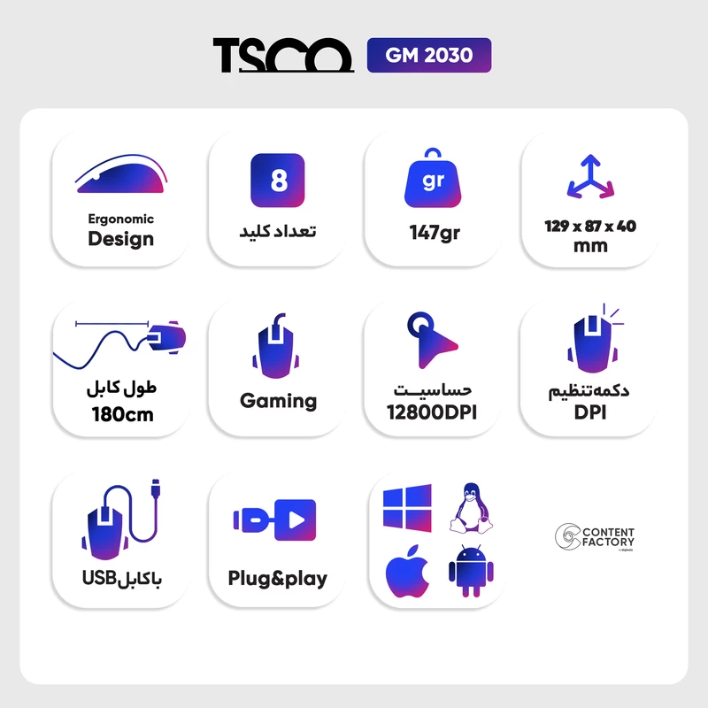 ماوس گیمینگ تسکو مدل GM 2030 هشت کلید عملکردی دارد. این 8 کلید را شما میتوانید بر حسب نیاز و سلیقه خودکنترل و سفارشیسازی کنید.