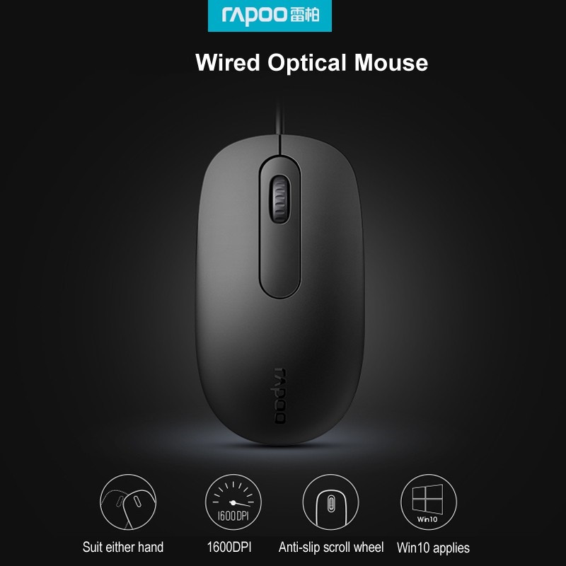موس سیم دار RAPOO مدل 120 یک موس با دقت 1600 این موس روی ویندوز 10، ویندوز 8.1، ویندوز 8 و ویندوز 7 و XP  و که دستگاه های کامپیوتر و لب تاپ را پشتیبانی می‌کند و می توان با هر دو دست از آن استفاده نمود