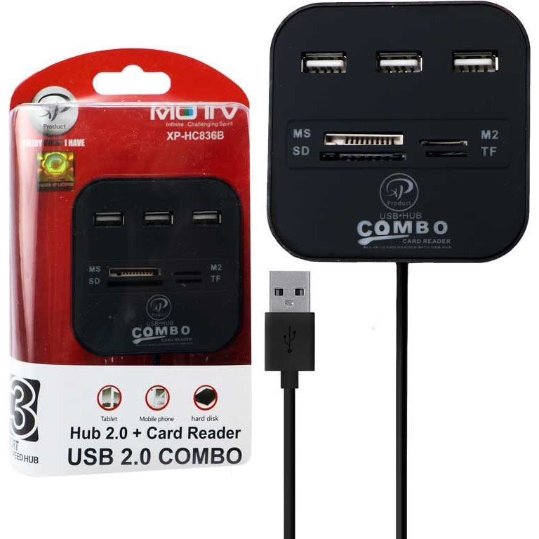 هاب XP مدل D836 دارای 3 پورت USB و قابلیت پشتیبانی M2/MMC/MS/SD را با سرعت انتقال 480Mbps و اتصال آداپتور را دارد و دارای سازگاری با لب تاپ و کامپیوتر است