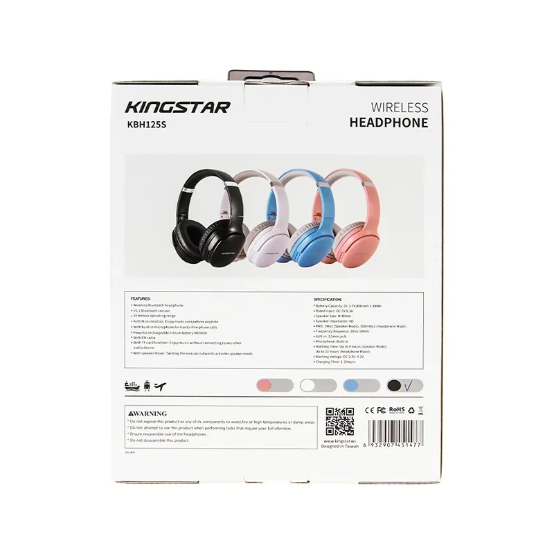این محصول زیبا و شیک برند کینگ استار با ظرفیت باتری داخلی لیتیوم قابل شارژ 400 میلی‌آمپر یک میکروفون داخلی با قابلیت مکالمه همانند هندزفری را نیز داراست. همچنین زمان پخش موسیقی این محصول با 2 الی 3 ساعت شارژ تا 4 ساعت در حالت اسپیکر و تا 10 ساعت در حالت هدفون با 50٪ حجم صدا است. هدبند این محصول با پلاستیک چرم پوشانده شده است. قابلیت افزایش یا کاهش ارتفاع در این قسمت آن را برای استفاده هر کاربری مناسب می‌کند. هدفون اسپیکر بی‌سیم کینگ استار مدل KBH125S فرکانس 20 هرتز تا 18 کیلوهرتز را ساپورت می‌کند.