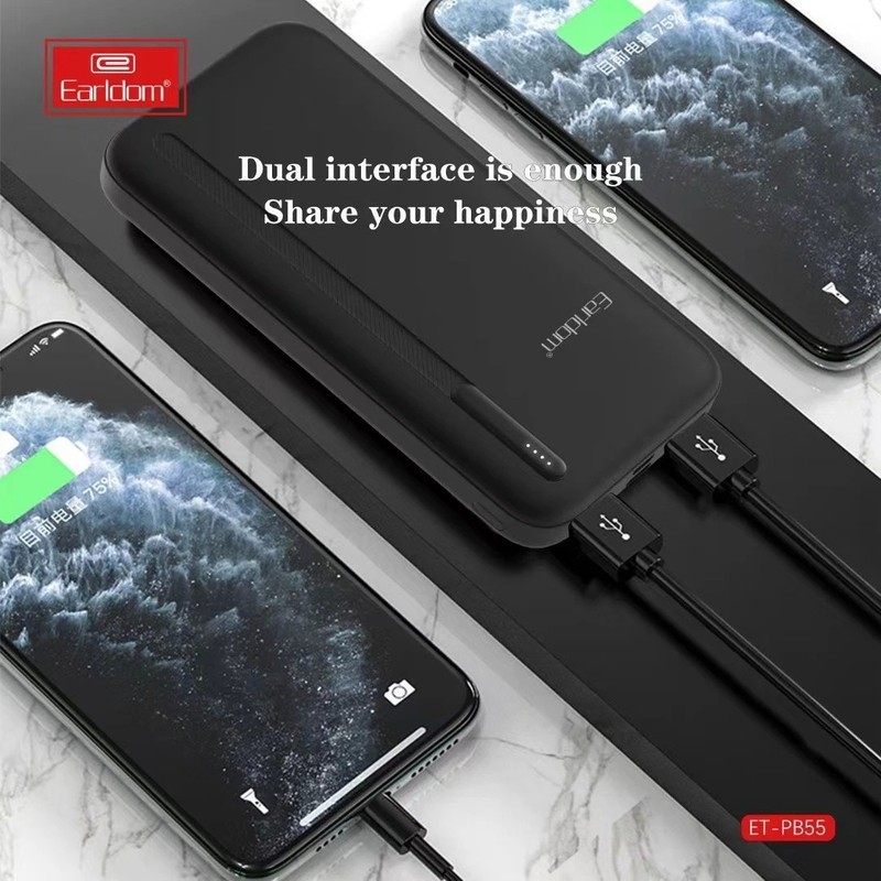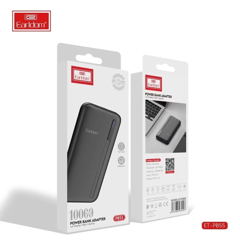 پاوربانک ارلدام مدل PB55 که با ظرفیت 10000 میلی آمپر است و قابلیت فست شارژ را نیز دارد و با ظاهری مستطیلی دارای LED برای نشان دادن شارژ این پاوربانک 2.1 آمپری است که برای یک پاوربانک نسبتا جریان خوبی دارد که میتواند همزمان 2 دستگاه را شارژ کند