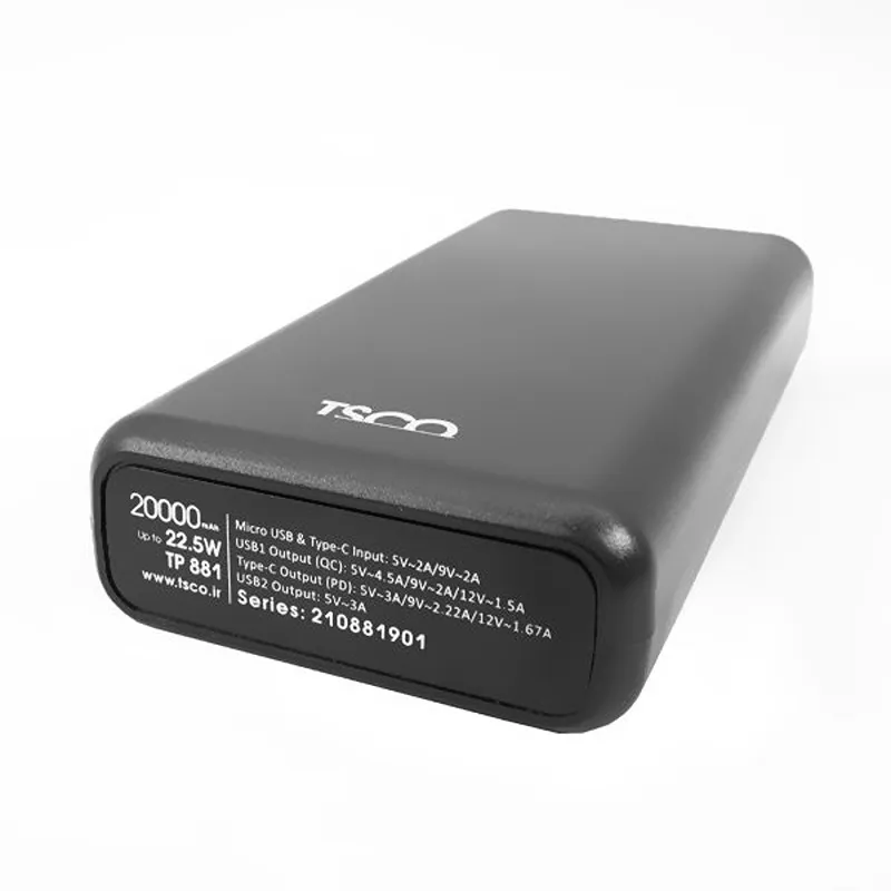 پاوربانک تسکو مدل TP 881 به شما اجازه میدهد تا در هر زمان و هر مکان، هر دستگاه الکترونیکی که نیاز داشته باشید را بهراحتی شارژ کنید.