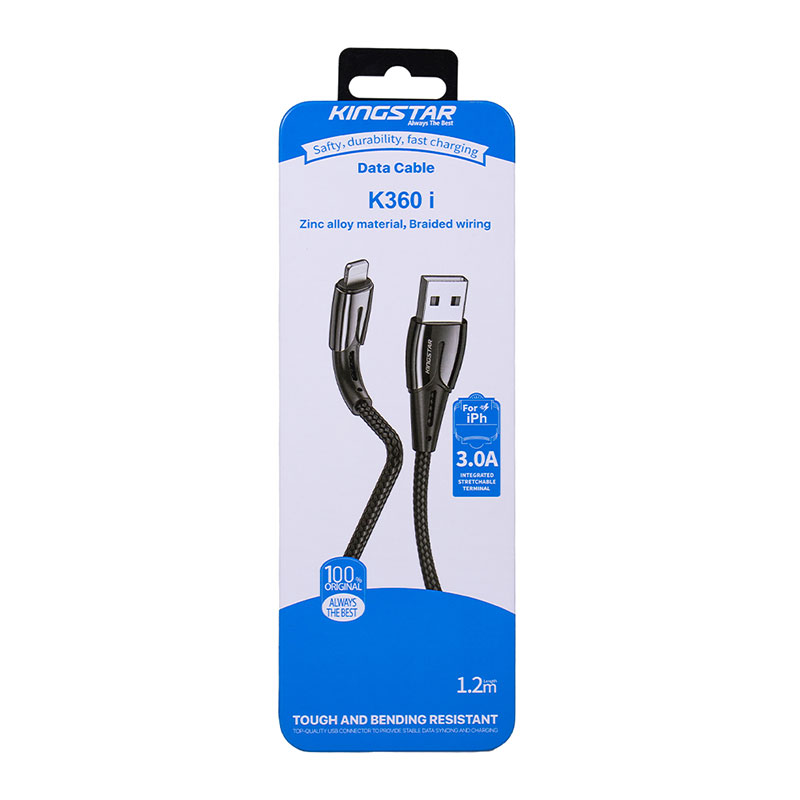 کابل لایتنینگ K360i کینگ استار با قابلیت شارژ سریع و انتقال دیتا با جنس کنفی برای گوشی و سایر لوازم جانبی که دارای پورت لایتنینگ نیز استفاده می شود و سرعت انتقال داده آن نیز 480MB/S می‌باشد.