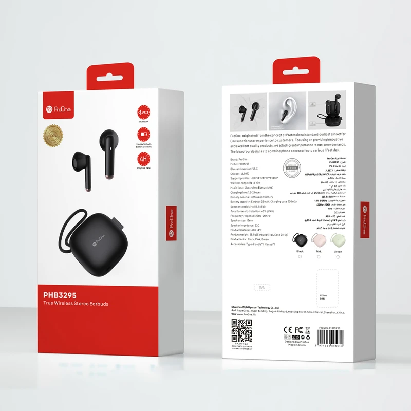 همچنین، ظرفیت باتری کیس 300 میلیآمپر ساعت و هر گوشی 25 میلیآمپر ساعت، اطمینان از دوام و عملکرد قابل اعتماد را به کاربر میدهد. با توجه به این ویژگیها، ایرپاد PROONE مدل PHB3295 گزینهای ایدهآل برای کسانی است که به دنبال کیفیت، راحتی و عملکرد بالا در هدفونهای بیسیم خود هستند.